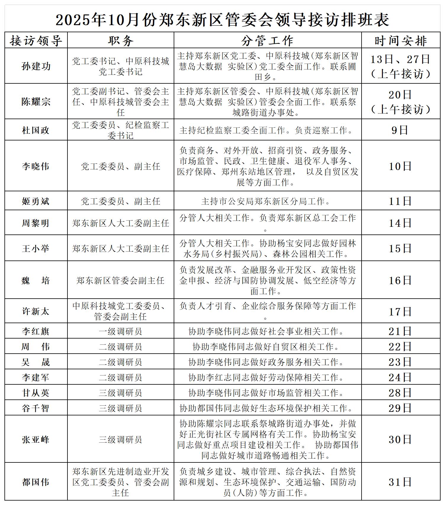 为进一步密切联系群众,畅通群众信访渠道,解决群众合理合法诉求,现将郑东新区党政领导接访时间公开发布。接访地点为郑东新区龙湖中环南路与龙翔四街向北50米路西社会治安综合治理中心。