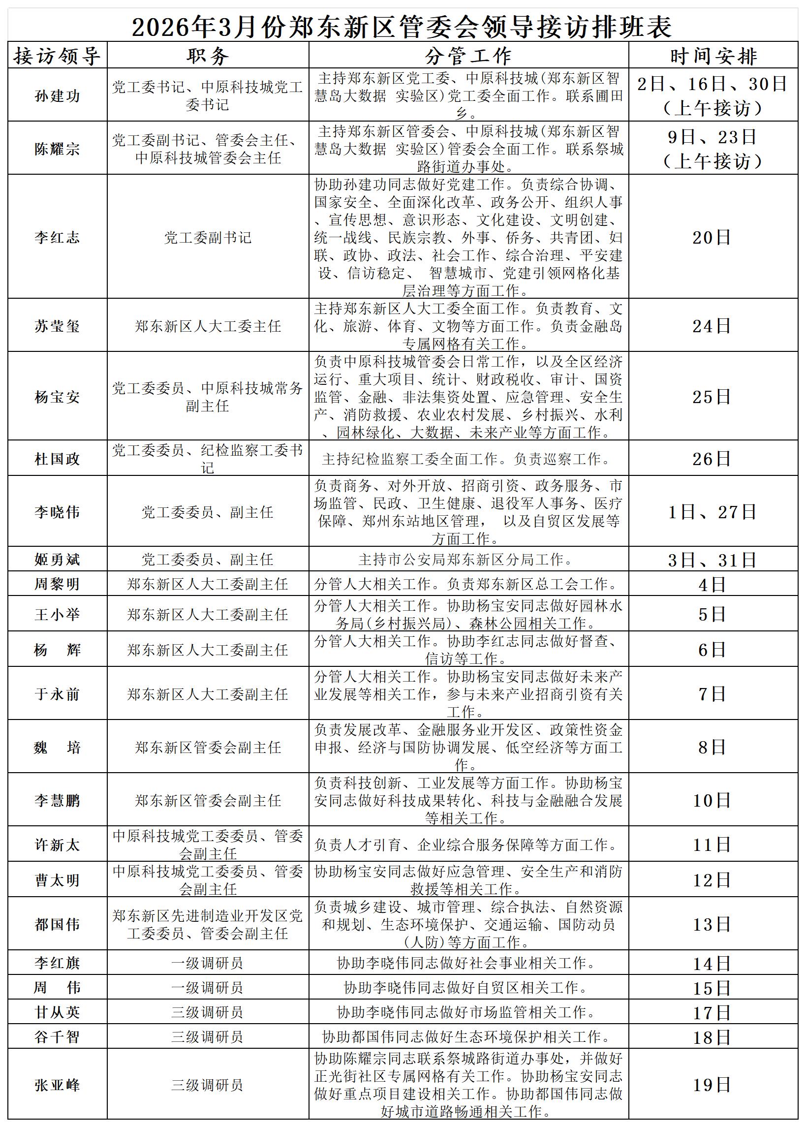 为进一步密切联系群众,畅通群众信访渠道,解决群众合理合法诉求,现将郑东新区党政领导接访时间公开发布。接访地点为郑东新区龙湖中环南路与龙翔四街向北50米路西社会治安综合治理中心。