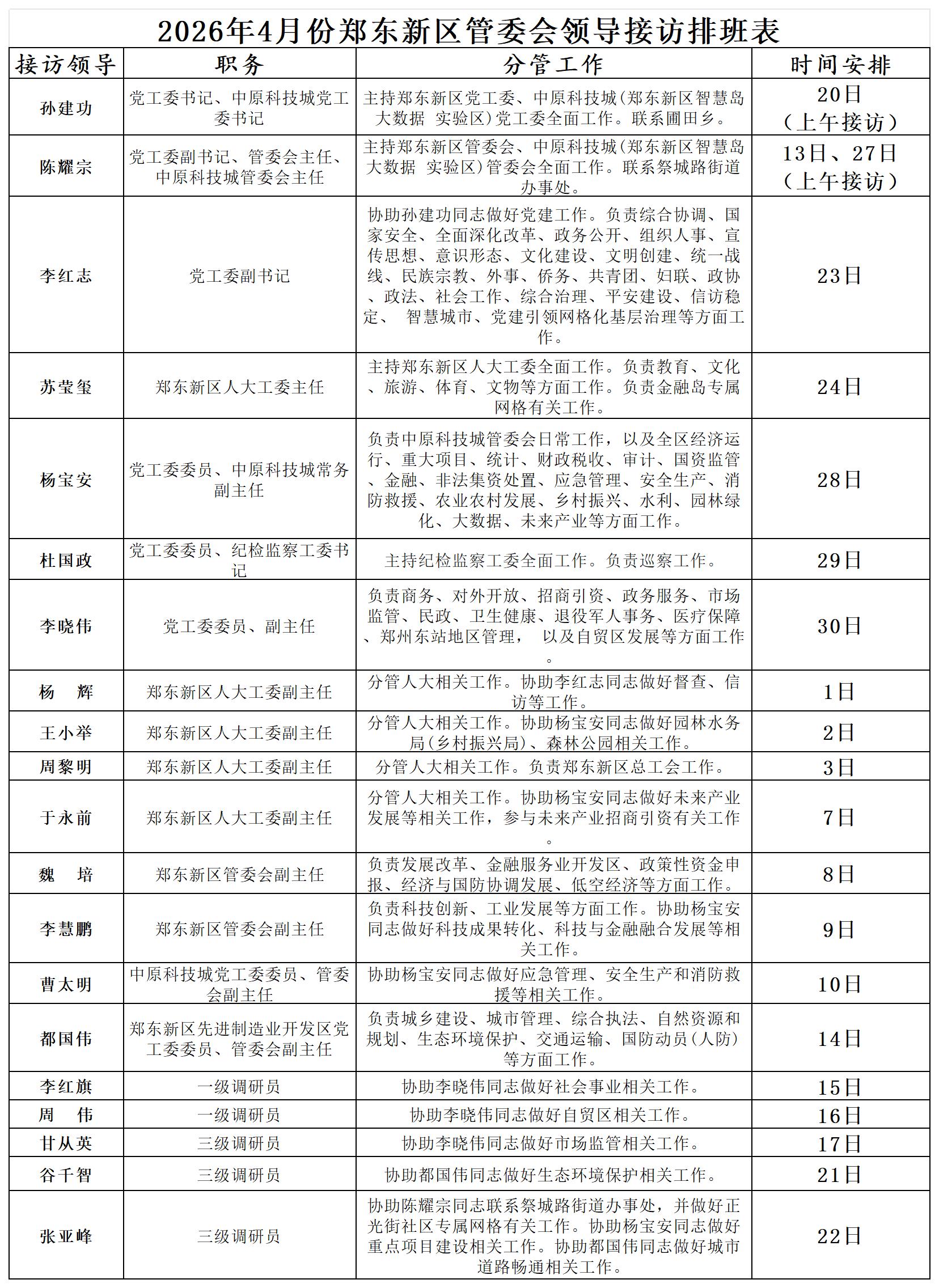 为进一步密切联系群众,畅通群众信访渠道,解决群众合理合法诉求,现将郑东新区党政领导接访时间公开发布。接访地点为郑东新区龙湖中环南路与龙翔四街向北50米路西社会治安综合治理中心。